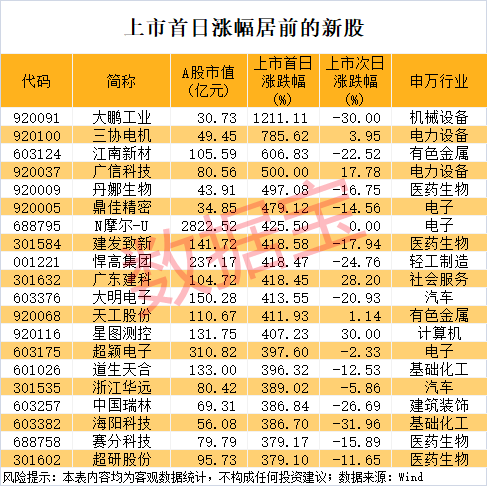 从上市首日表现来看,2025年上市新股整体表现可观。据数据宝统计,2025年新股上市首日平均涨幅达到254.89%,这一水平与2024年新股基本持平。31股上市首日涨幅超300%,包括大鹏工业、三协电机、江南新材等。11月21日上市的新股大鹏工业夺冠,上市首日该股涨幅达到1211.11%。