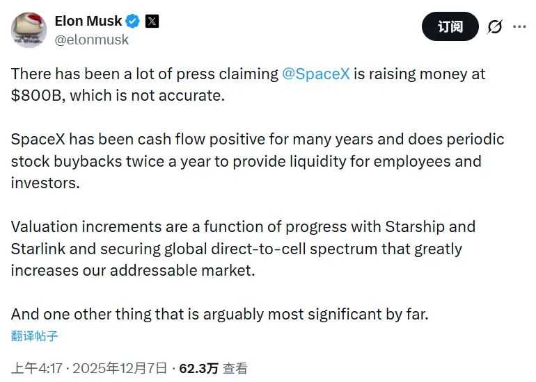 他在社交媒体上发帖称,SpaceX以8000亿美元估值融资的消息“并不准确”(not accurate)。