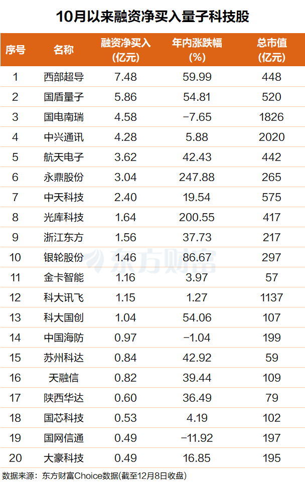 东方财富Choice数据显示,自10月以来,杠杆资金净买入多只量子科技概念股,其中中兴通讯排名第一,融资净买入超7亿元;国盾量子排名第二,融资净买入接近6亿元。