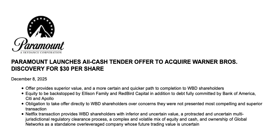 派拉蒙宣布,拟以每股30美元的纯现金要约收购华纳兄弟探索公司的所有流通股。公告称,这笔出价对应1084亿美元的企业价值。