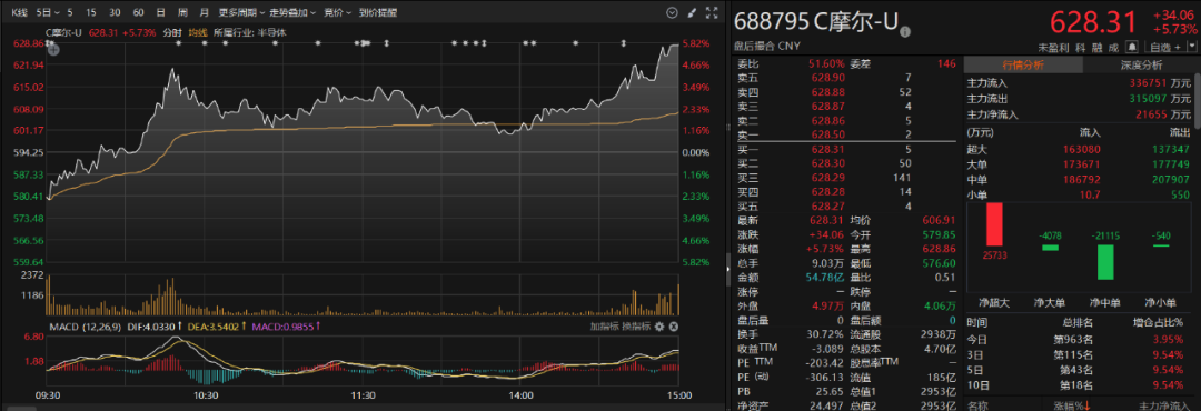 今日尾盘,摩尔线程股价快速拉升,截至收盘涨5.73%,报628.31元/股。