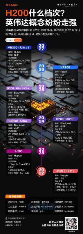消息面上,据环球时报援引报道称,美国总统特朗普当地时间12月8日在社交媒体上发文宣布,美国政府将允许英伟达向中国出售其H200人工智能芯片。公开资料显示,H200芯片性能虽高于H20,但其并非英伟达目前的最高端产品。