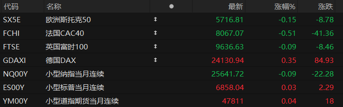 周二盘前,美股三大股指期货涨跌不一,欧洲主要指数多数下跌。截至发稿,纳斯达克100指数期货跌0.09%,标普500指数期货涨0.03%,道指期货涨0.04%。