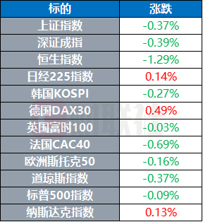 欧股主要指数收盘涨跌不一,欧洲斯托克50指数跌0.16%,英国富时100指数跌0.03%,法国CAC40指数跌0.69%,德国DAX30指数涨0.49%。