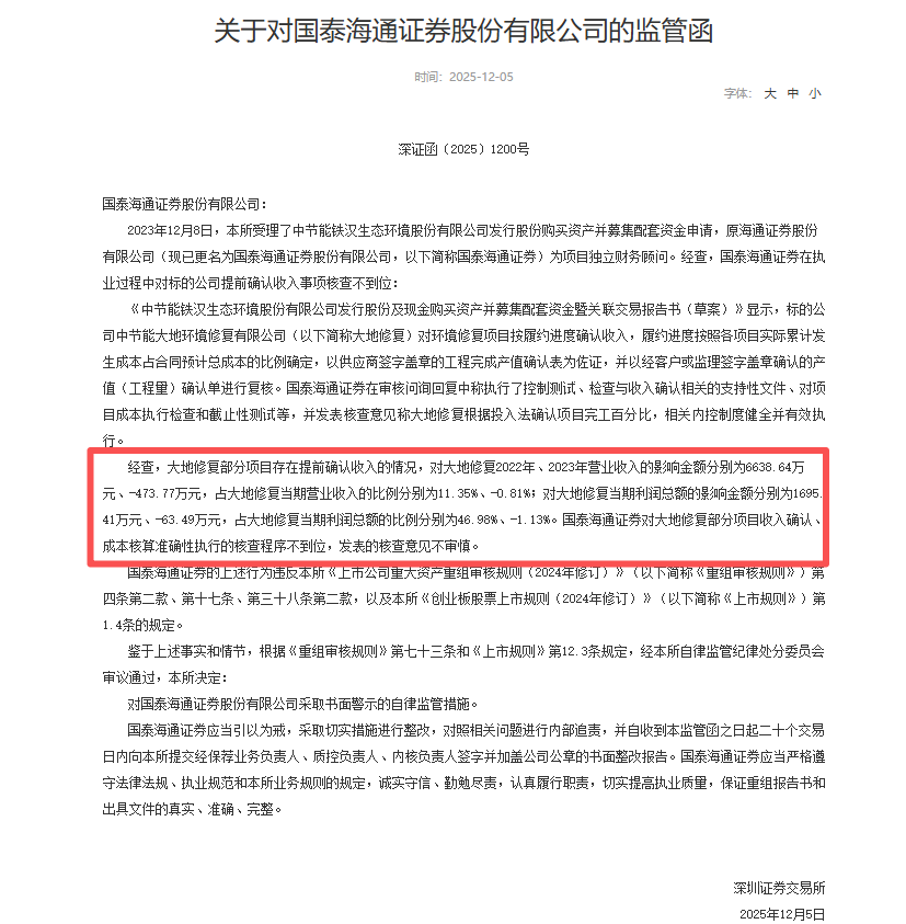 深交所认定,国泰海通对大地修复部分项目收入确认、成本核算准确性执行的核查程序不到位。
