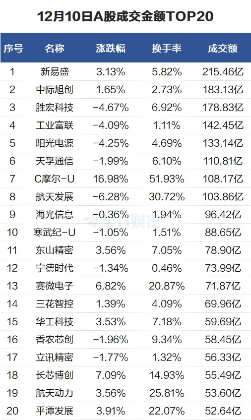 12月10日,上证指数微跌,收报3900.5点,成交额缩减至1.78万亿元。新易盛和中际旭创成交活跃。