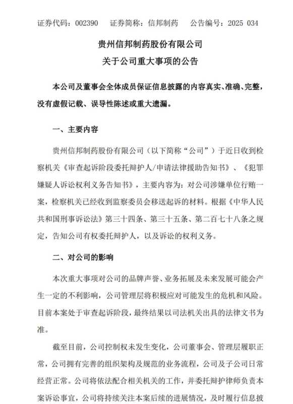 针对此次被起诉,信邦制药在公告中表示,该事项可能对公司品牌声誉、业务拓展及未来发展产生不利影响。目前案件处于审查起诉阶段,最终结果以司法机关出具的法律文书为准。公司控制权未发生变化,日常经营正常。公司将依法配合相关机关工作,并委托辩护律师负责本案诉讼事宜,持续关注案件进展并履行信息披露义务。