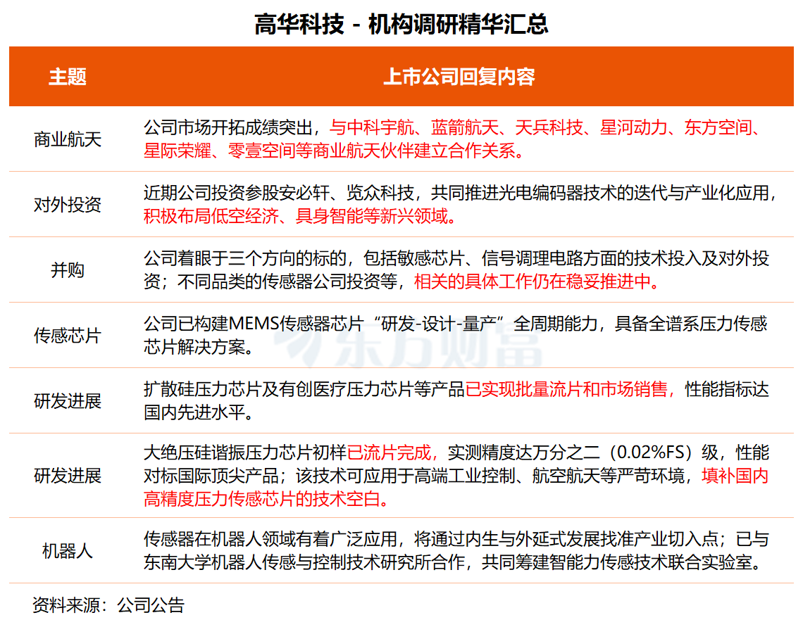 民生证券此前研报指出,高华科技公司是高可靠性传感器国家级专精特新“小巨人”企业,在航空装备及无人机领域有长期配套经验及突出技术能力;在航天方向的产品应用场景不断丰富。公司积极布局商业航天、机器人产业、低空经济等前沿技术领域,将充分受益于低轨卫星和人形机器人的加速产业化。