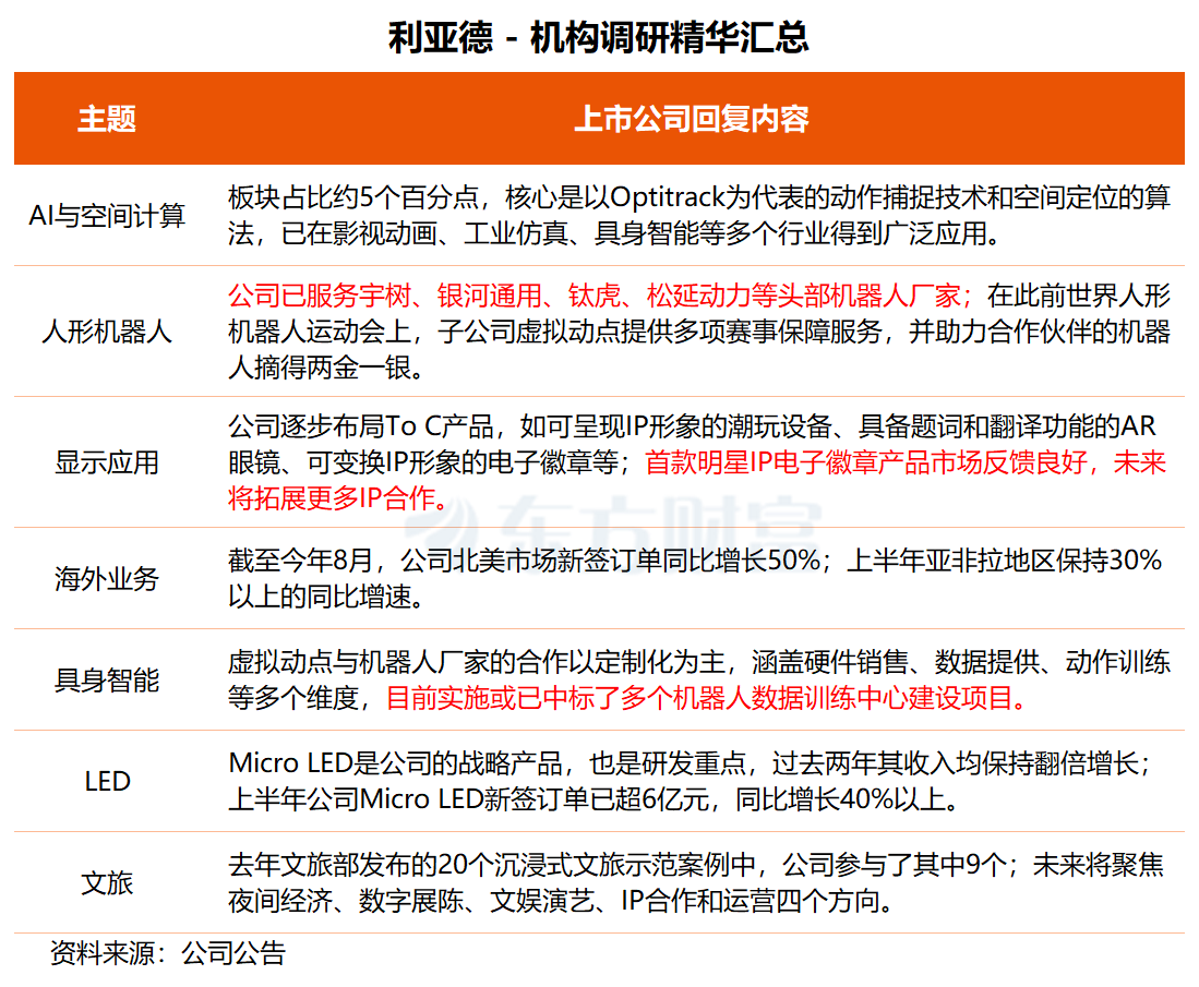 利亚德表示,公司已服务宇树、银河通用、钛虎、松延动力等头部机器人厂家,在2025年8月的世界人形机器人运动会上,子公司虚拟动点提供了多项赛事保障服务,并助力合作伙伴的机器人摘得两金一银。
