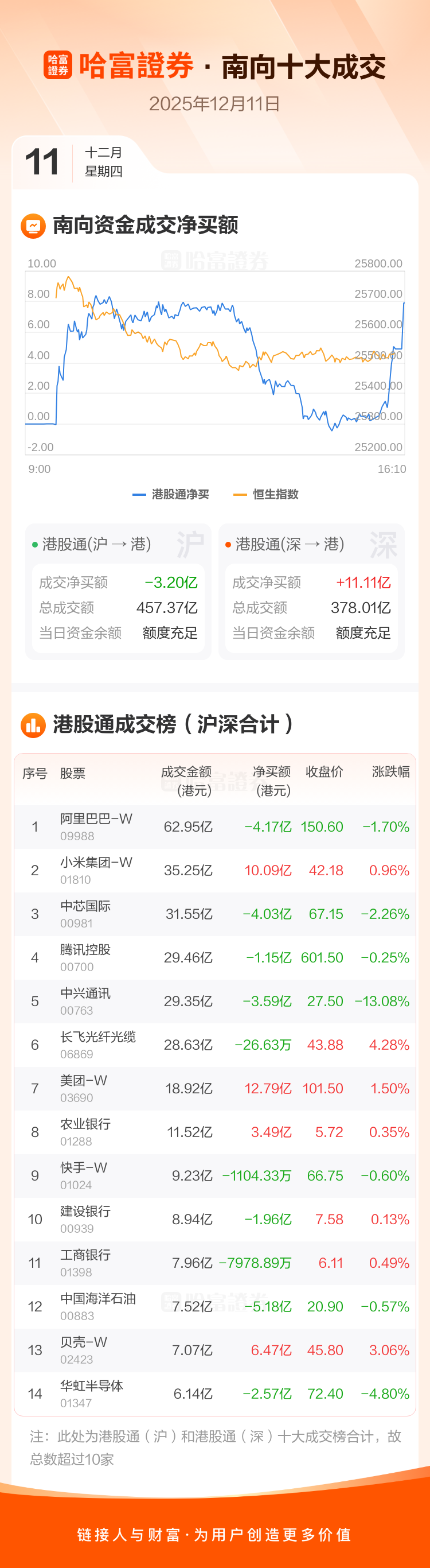 恒生指数12月11日跌0.04%,收报25530.51点。南向资金今日净买入港股7.91亿港元。南向资金今日成交额835.38亿港元,港股大市成交1824.77亿港元。