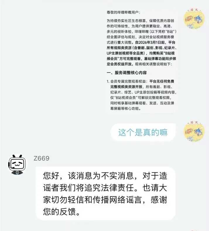 具体来看,一条关于B站致用户的截图在网络流传,其中称,“为持续夯实社区生态根基,保障优质内容创作的可持续性,为用户提供更稳定、高清、多元的视听体验,自2026年3月1日起,哔哩哔哩平台所有视频类资源均需购买B站视频会员方可完整观看,基础弹幕功能同步绑定会员权益开放。”