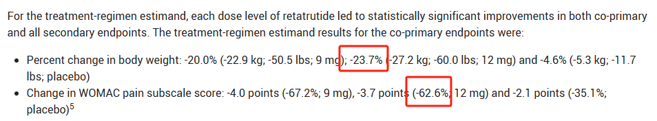当地时间周四(12月11日),礼来在官网公布了retatrutide的Ⅲ期临床试验研究数据,最高剂量组(12毫克)在68周内体重减轻了23.7%,膝关节疼痛分量表评分下降了62.6%。