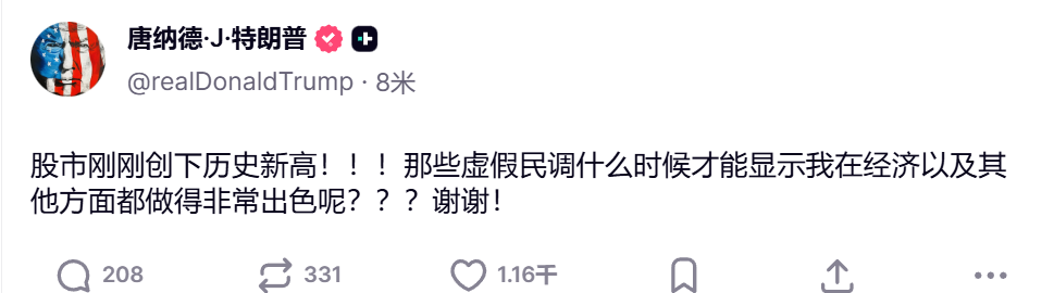 美国总统特朗普发文称,“股市刚刚创下历史新高!!!假民调什么时候才能显示我在经济方面表现出色,以及其他方面的成就?”