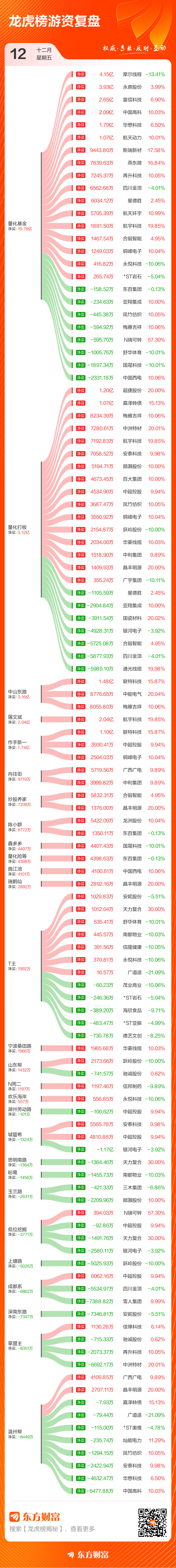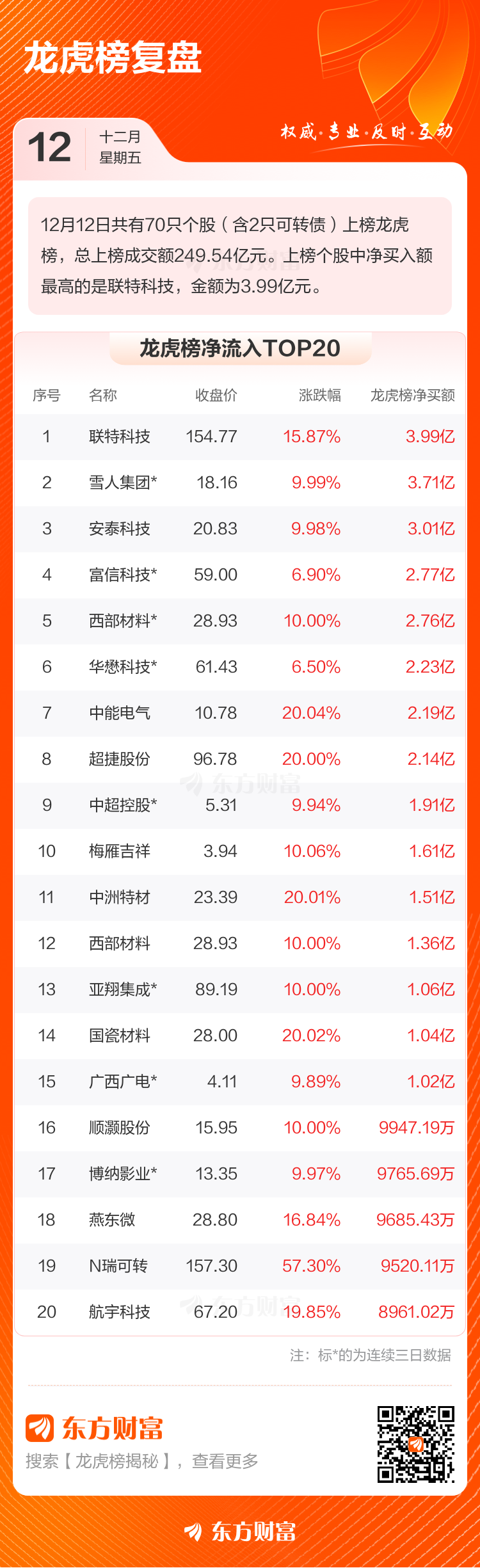 ⬆️12月12日共有70只个股(含2只可转债)上榜龙虎榜,总上榜成交额249.54亿元。上榜个股中净买入额最高的是联特科技,金额为3.99亿元。⬇️