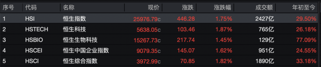12月12日,港股三大指数集体大涨。其中,恒生指数收涨1.75%,报25976.79点,恒生科技指数涨1.87%,恒生中国企业指数涨1.62%。全日大市成交额为2427亿港元,南向资金净卖出52.87亿港元。