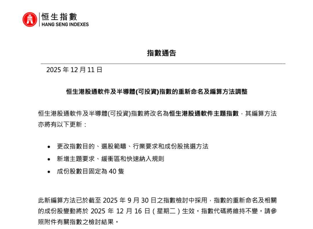 消息面上,据恒生指数官网,恒生港股通软件及半导体(可投资)指数将改名为恒生港股通软件主题指数,成份股数目固定为40只,加入阅文集团、趣致集团、美图、汇量科技4只股票。剔除ASMPT、中芯国际、华虹半导体、英诺赛科4只股票,于2025年12月16日(星期二)生效。