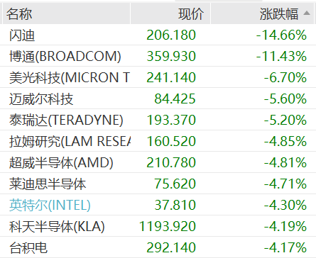 芯片概念重挫,市场对AI泡沫的担忧再现。博通大跌逾11%,甲骨文在前一日跌近11%后再跌超4%;芯片股闪迪、Oklo跌约15%,CoreWeave跌10%,嘉楠科技跌超9%。