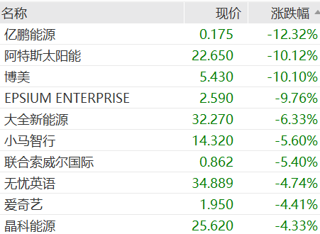 热门中概股普跌,纳斯达克中国金龙指数跌0.3%,亿鹏能源跌12.3%,阿特斯太阳能、博美跌超10%,大全新能源、小马智行跌超5%;上涨方面,智能未来涨超4%,好未来、新东方、网易涨超2%。