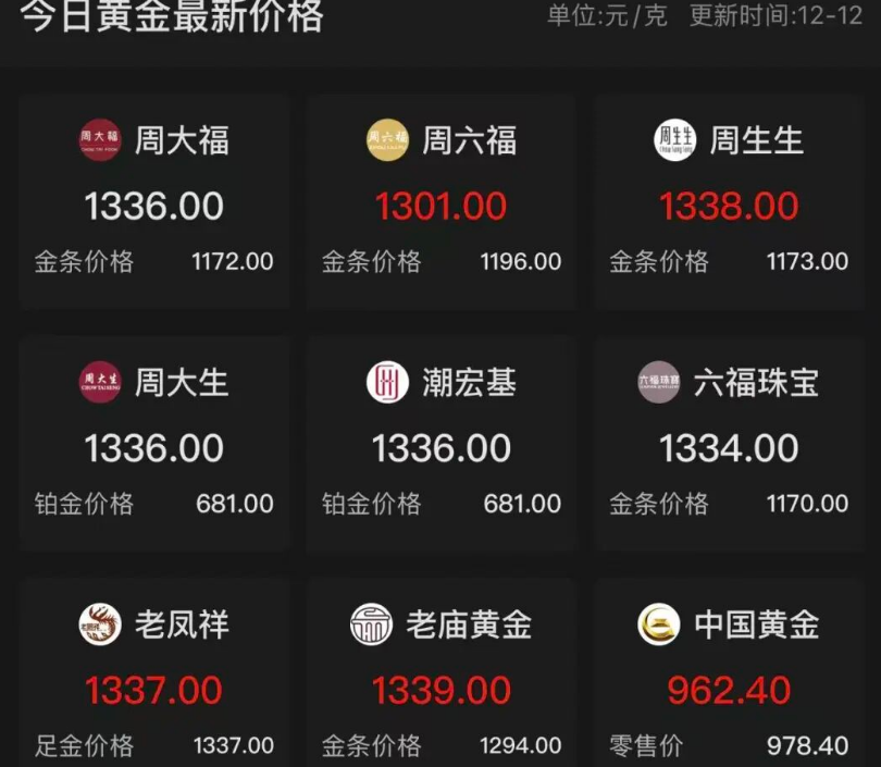受国际金价上涨影响,12月12日,周生生、老庙黄金、老凤祥等国内部分品牌金饰克价也创年内新高。周生生金饰涨至1338元/克,老庙黄金涨至1339元/克,老凤祥金饰涨至1337元/克。