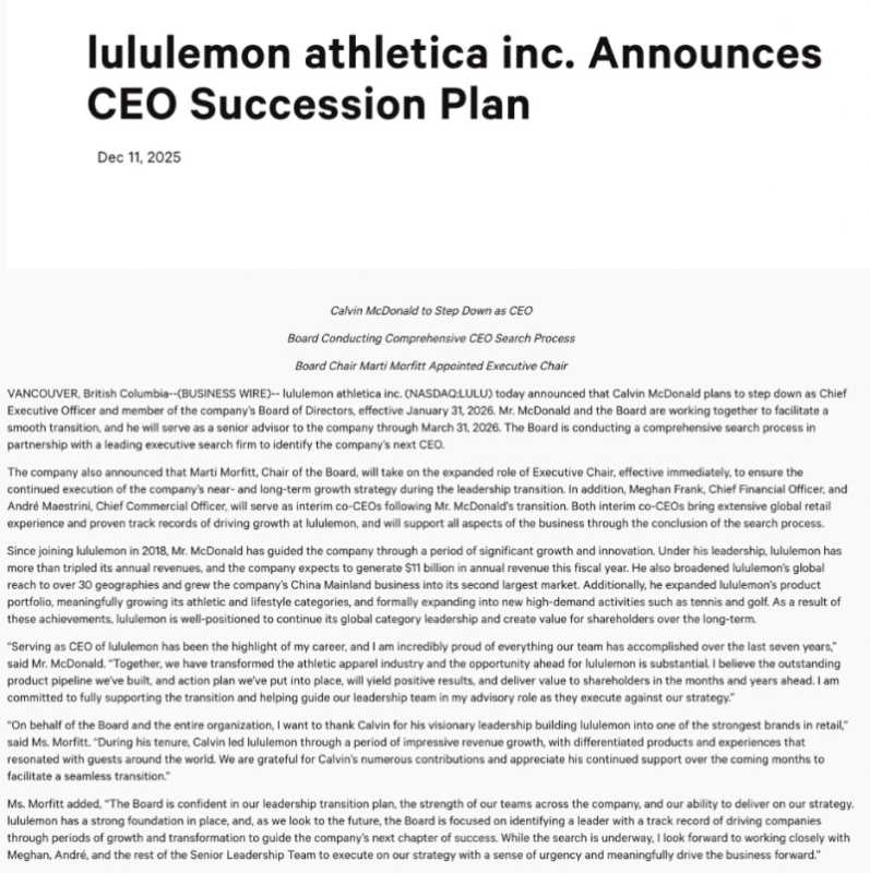 当地时间12月11日,lululemon官网发布公告称,已任职超七年的Calvin McDonald将辞去首席执行官一职。此决定将于2026年1月31日生效。为确保平稳过渡,Calvin McDonald将在2026年3月31日前担任公司高级顾问。同日,lululemon还最新发布了2025财年第三季度财报。在lululemon宣布领导层变动和季度业绩后,其股价在盘后交易中上涨了10%。