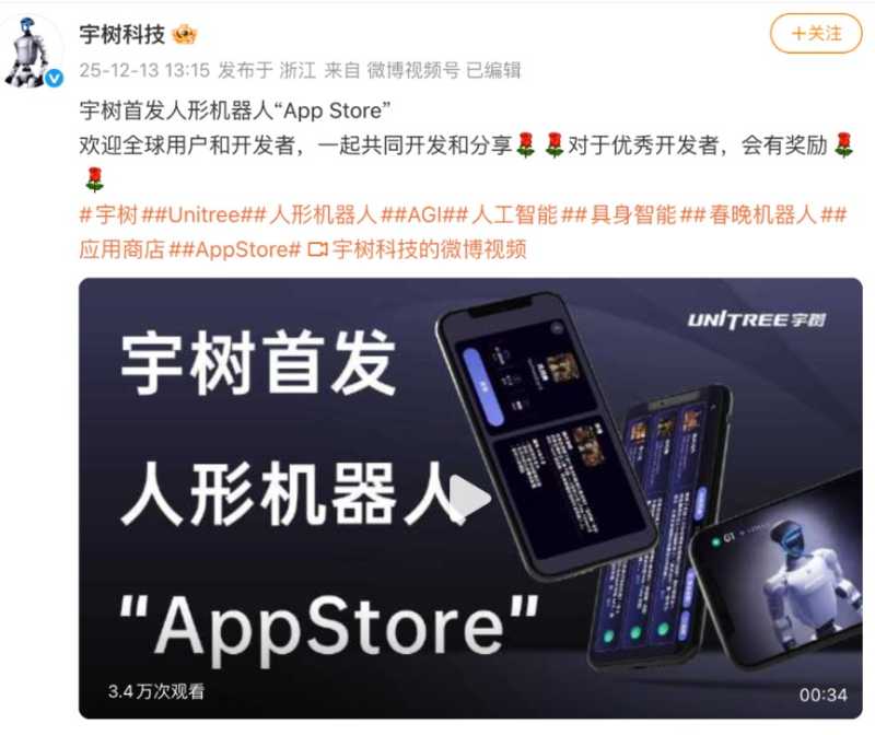 12月13日,宇树科技宣布首发人形机器人“App Store”(应用商店),用户可以将训练好的舞蹈、武术、干活等模型一键上传分享,也可以下载其他开发者开发的动作部署到机器人。