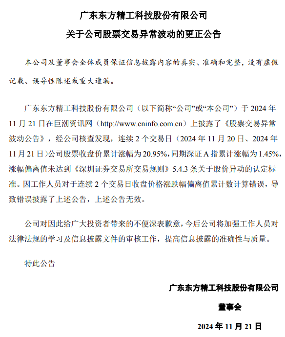 东方精工发布更正公告,澄清先前披露的《股票交易异常波动公告》中的错误信息,指出涨幅偏离值未达到异动认定标准,因工作人员计算错误导致,公司表示将加强内部管理,确保信息披露准确性。