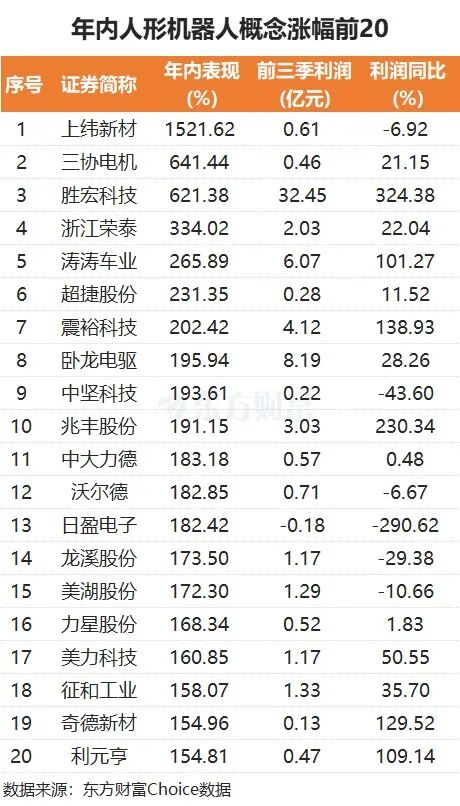 个股而言,人形机器人概念中有37股年内翻倍,其中得益于智元机器人而股价飞涨的上纬新材,年内大涨1521.62%。9月8日首发上市的三协电机,上市以来大涨641.44%。胜宏科技、浙江荣泰、涛涛车业等年内也涨幅靠前。