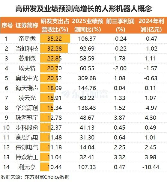从研发投入和2025年业绩预测角度来看,在研发支出占营收比超10%且2025年业绩预测同比增超10%的人形机器人概念股中,帝奥微处在前列,该股前三季度研发支出占营收比为35.22%,机构预测的2025年业绩同比增幅可达106.37%。当虹科技紧随其后,前三季度研发支出占比为32.28%,2025全年业绩预测同比可达92.69%。芯朋微、埃夫特、奥比中光等个股也位列高研发及业绩预测高增长个股榜单。