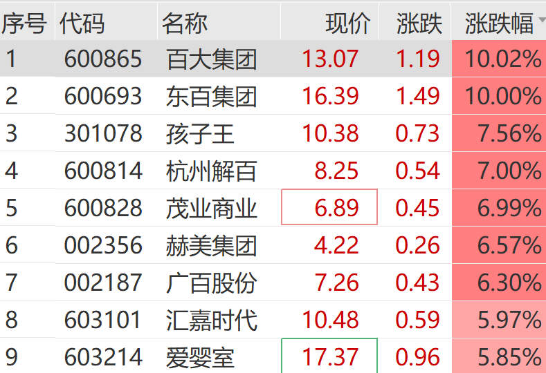 商贸零售板块走强,百大集团3连板,东百集团涨停,孩子王、爱婴室等跟涨。