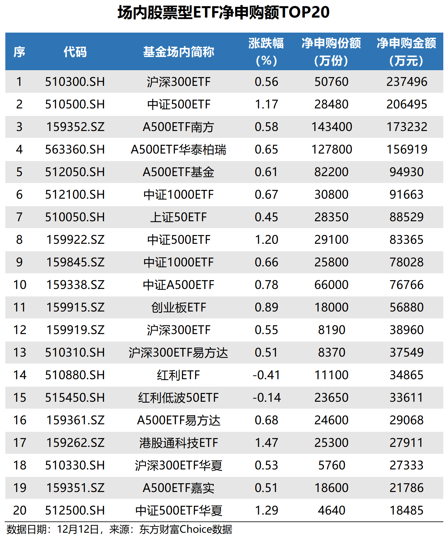 上周五,净申购金额最多的为沪深300ETF,净申购金额为23.75亿元。此外,中证500ETF和A500ETF南方也获购居前,净申购金额依次为20.65亿元和17.32亿元。