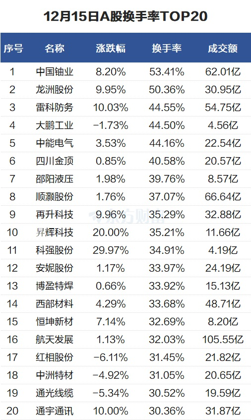 当天换手率最高的个股为中国铀业,全天换手率53.41%。龙洲股份紧随其后,全天换手率50.36%。