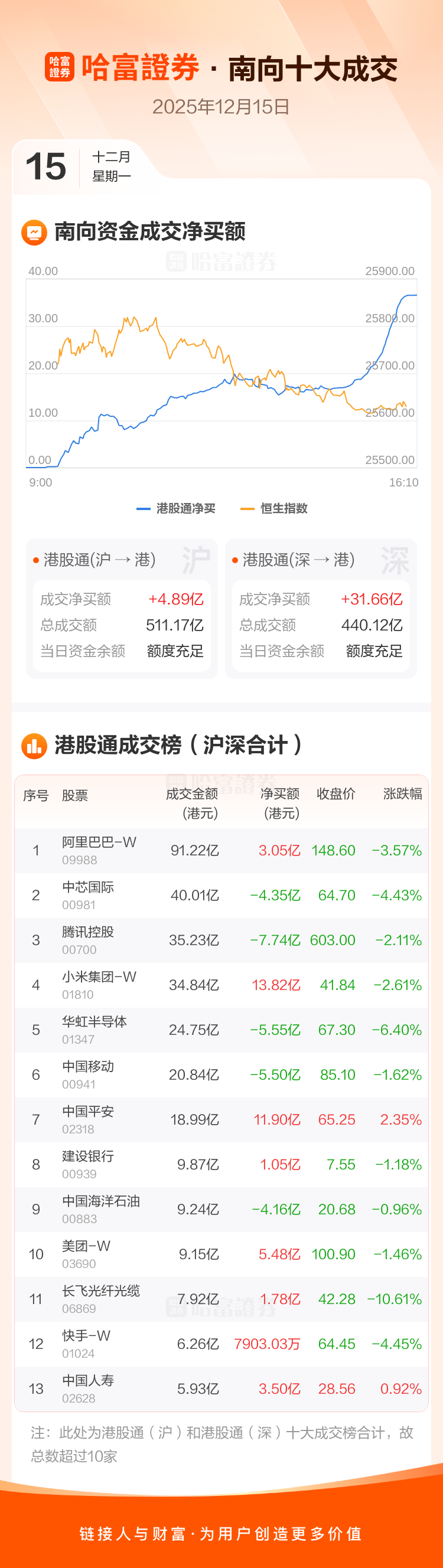 恒生指数12月15日跌1.34%,收报25628.88点。南向资金今日净买入港股36.54亿港元。南向资金今日成交额951.29亿港元,港股大市成交2042.89亿港元。