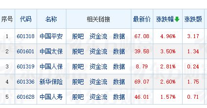12月15日,市场总体在低位震荡,保险、零售业等板块逆市上涨。截至收盘,中国平安最新股价为67.08元/股,涨幅4.96%;中国太保最新股价为39.58元/股,涨幅3.5%;中国人保最新股价为8.79元/股,涨幅2.81%;新华保险最新股价为69.07元/股,涨幅2.6%;中国人寿最新股价为46.01元/股,涨幅1.57%。