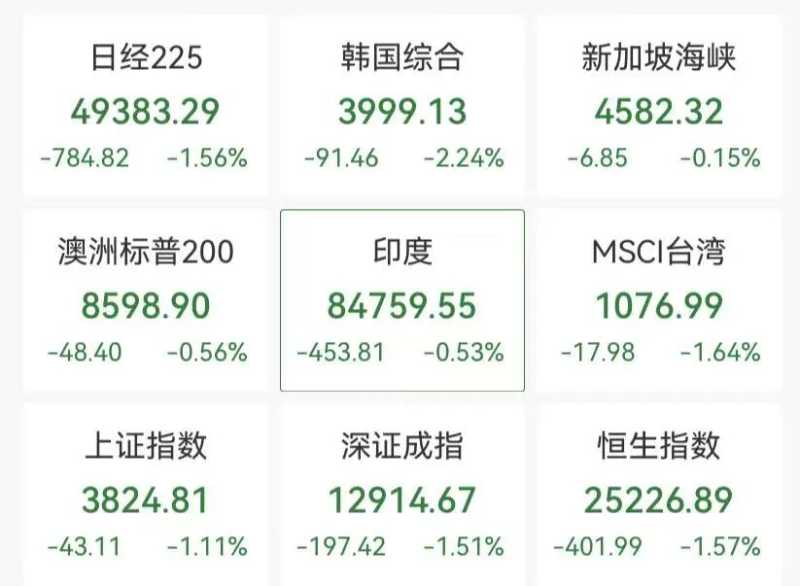 12月16日,亚太主要股指延续跌势,日经225指数收跌超1%,韩国KOSPI指数收跌超2%,A股三大指数集体飘绿,港股午后跌幅进一步扩大;黄金白银盘中跳水,现货铂金逆势飘红。