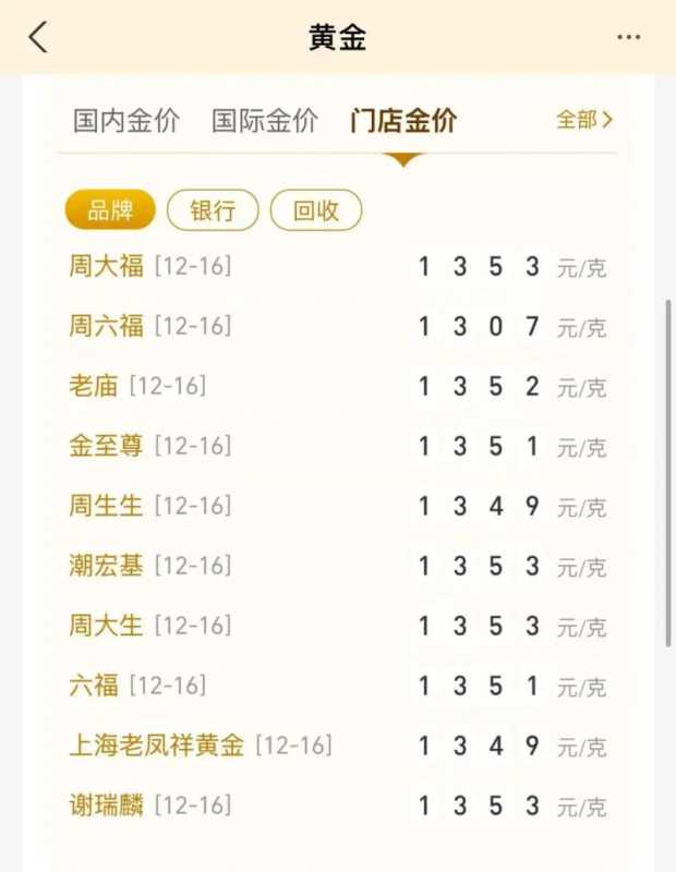 受此影响,国内品牌金饰价格多日连涨态势也随之终结。12月16日,周生生足金饰品报1349元/克,较昨日跌4元/克,终结自12月10日起的五连涨;周大福、老庙黄金、老凤祥等品牌,金饰克价较昨日保持不变。