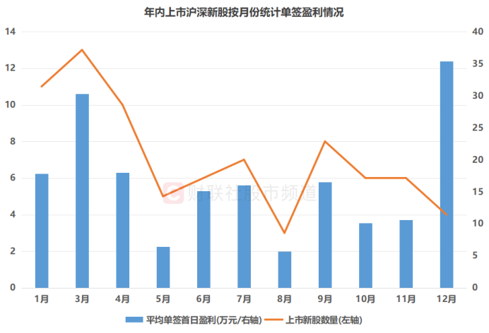 从打新盈利水平上看,仅统计年内上市的沪深新股,截至今日收盘,受摩尔线程打新高盈利影响,12月新股平均首日单签盈利近8.86万元,在各月份中位居第一。同时,6月、3月、7月、9月期间的打新收益也相对较高,平均单签盈利分别达2.52万元、2.33万元、2.29万元、2.10万元。而在5月、1月、10月期间,其单签首日打新收益相对靠后。