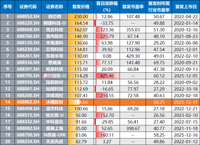 受摩尔线程打新高盈利的示范效应和新股市场持续活跃提振,即将上市的沐曦股份目前已成为投资者关注焦点。据悉,沐曦股份将于明日登陆科创板,此次上市发行价104.66元,在年内上市新股中位居第二,仅次于同为GPU龙头股的摩尔线程(114.28元)。若统计整个科创板的电子股,沐曦股份的发行价排名在150余只个股中位列第15位。