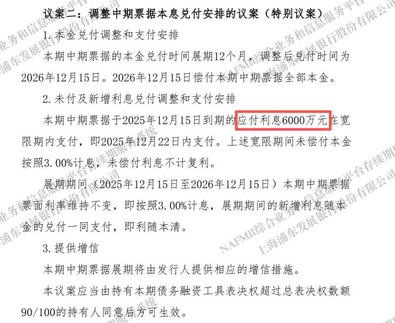 议案二即本息兑付安排,本金兑付时间仍然展期一年,但新增了利息兑付安排。本期中期票据于2025年12月15日到期的应付利息6000万元在宽限期内支付,即2025年12月22日内支付。上述宽限期间未偿付本金按照3.00%计息,未偿付利息不计复利。