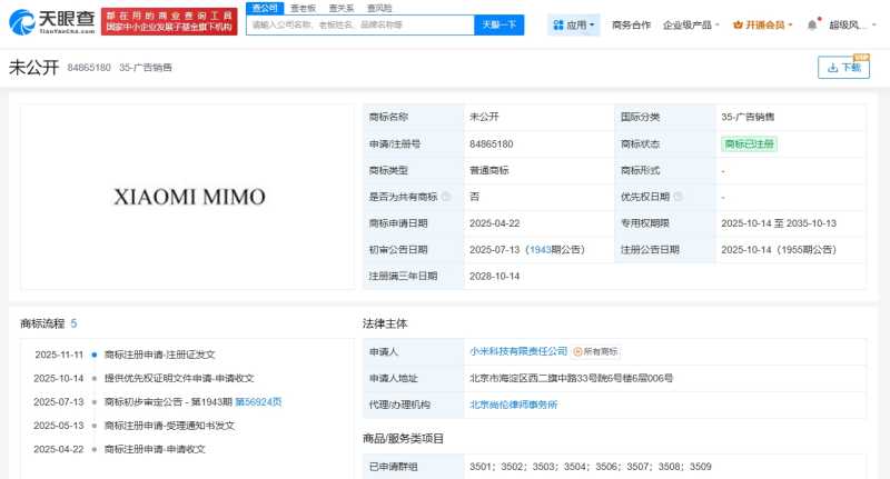 南方财经12月17日电,据报道,小米正式发布并开源新模型“MiMo-V2-Flash”,引发多方关注。根据官方体验页面信息,MiMo-V2-Flash还支持深度思考和联网搜索功能,既能对话聊天,也能在需要实时数据、最新动态或资料核对的场景里派上用场。天眼查知识产权信息显示,今年4月,小米科技有限责任公司曾申请注册多枚“XIAOMIMIMO”商标,国际分类包括广告销售、科学仪器、运输工具等,当前商标状态均为已注册。