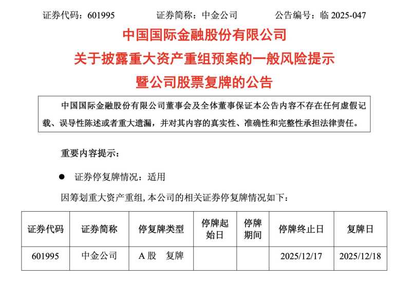 中金公司今日公告称,公司与东兴证券、信达证券正在筹划由中金公司通过换股方式吸收合并东兴证券、信达证券。公司A股股票自2025年11月20日起停牌,于2025年12月18日开市起复牌。