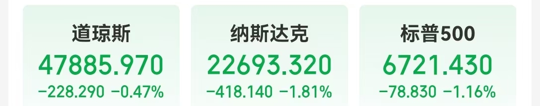 当地时间12月17日,美股三大指数集体收跌。道指跌0.47%;纳指下跌418.14点,跌幅1.81%;标普500指数跌1.16%。