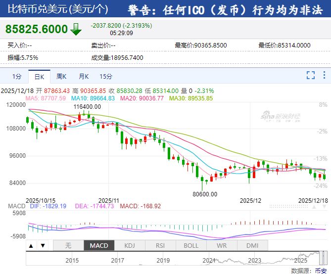 比特币向下跌破86000美元,过去24小时内下跌超2%。
