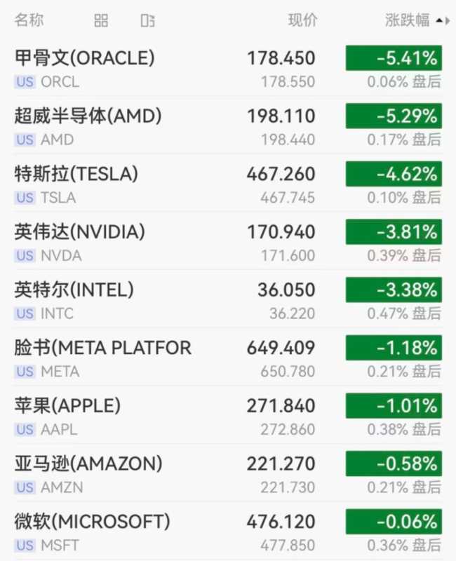 大型科技股集体下跌,热门个股方面,甲骨文跌超5%,特斯拉跌超4%,英伟达跌近4%,市值一夜蒸发1648亿美元(约合人民币11608亿元)。