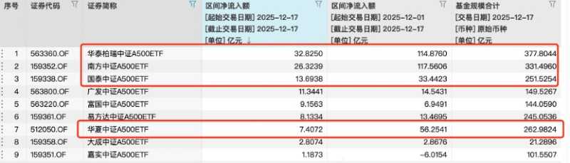 全市场A500相关ETF单日合计净流入111.6亿元,成交额第一的华泰柏瑞A500ETF获得最多资金流入,单日净流入32.83亿元,12月以来合计净流入114.88亿元,在11日规模突破300亿元基础上,继续攀高至当前的377.8亿元。