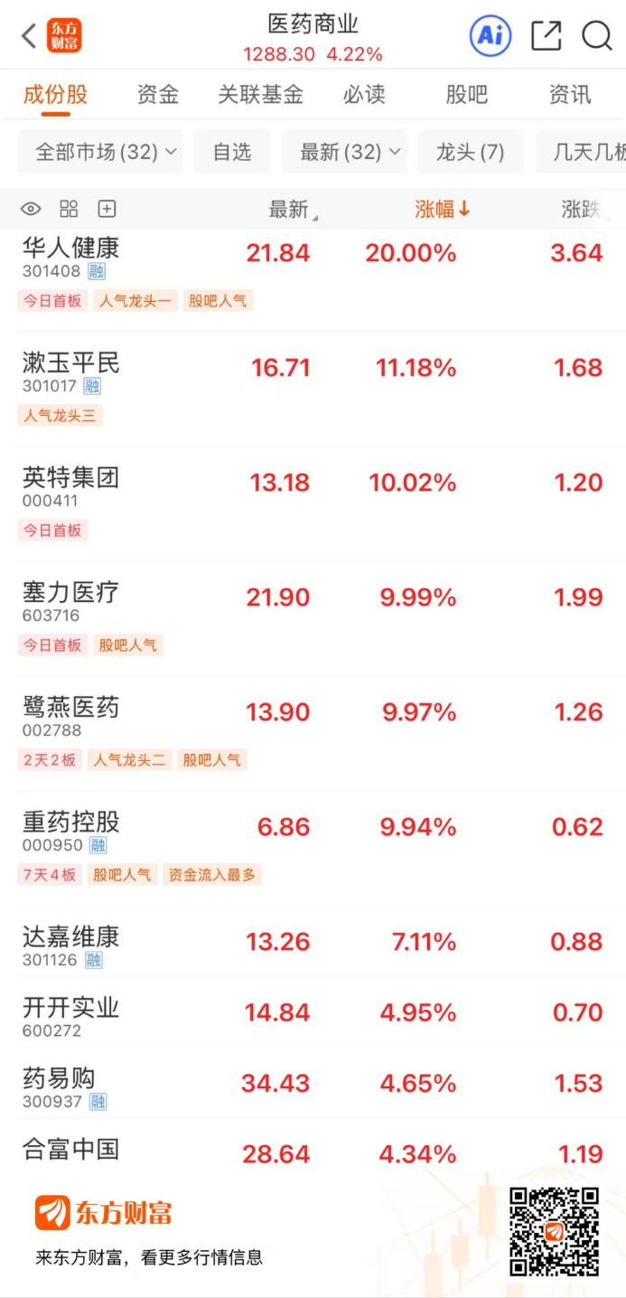 12月18日,医药商业掀起涨停潮,领涨A股行业板块。截至早间收盘,板块上涨4.22%,华人健康20CM涨停,漱玉平民涨超10%,英特集团、塞力医疗、鹭燕医药、重药控股涨停,达嘉维康涨超7%,开开实业、药易购、合富中国等涨超4%。