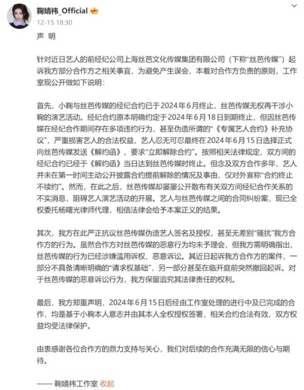 鞠婧祎方发布声明,称鞠婧祎与丝芭传媒的经纪合约已于2024年6月终止,合约原定2024年6月18日到期终止,但因丝芭传媒存在多项违约行为,甚至伪造补充协议,因此艺人在2024年6月15日要求解除合约。