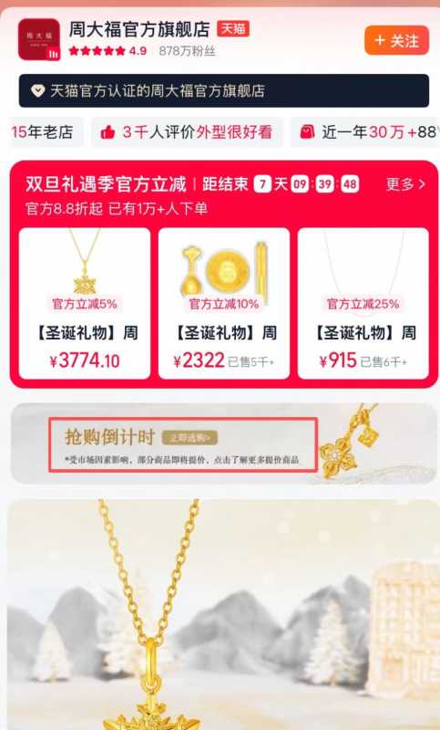 财联社12月18日讯,近日,周大福天猫官方旗舰店在首页不显眼的位置发布了一条提示:受市场因素影响,部分商品即将提价。