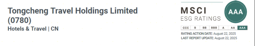 2025年8月25日,国际权威指数公司MSCI(Morgan Stanley Capital International,摩根士丹利资本国际公司)公布了同程旅行最新的ESG评级结果。基于在ESG方面的优异表现,同程旅行ESG评级升至AAA,这也是MSCI ESG的最高评级,位列全球Top 5%。
