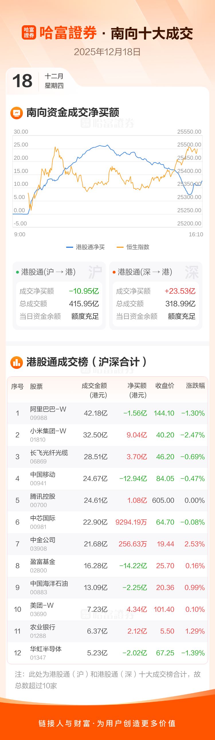恒生指数12月18日上涨0.12%,港股市场成交活跃。南向资金净买入港股12.57亿港元,成交额达734.95亿港元。小米集团、美团等股票表现抢眼。