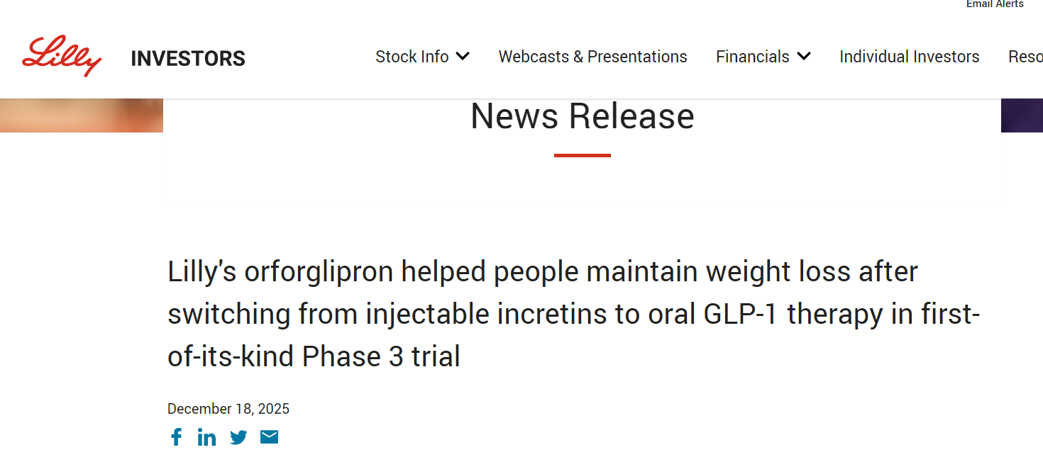财联社:礼来减肥药片或可维持减重效果